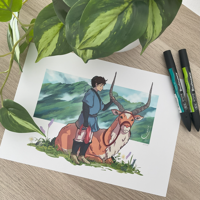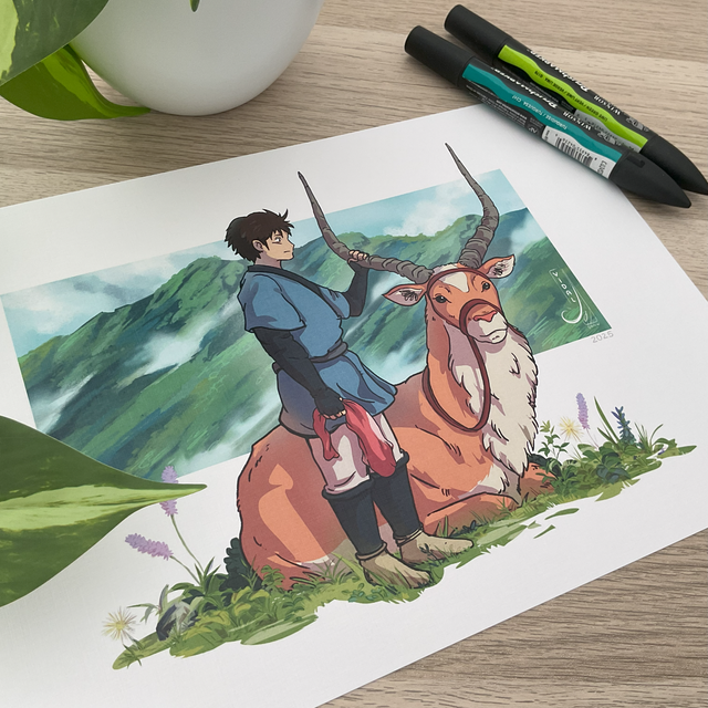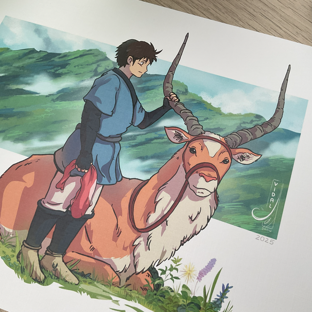 📖Mini Lore: Fanart de la película "La princessa Mononke" de Studio Ghibli. Personaje Ashitaka y su montura Yakkul.